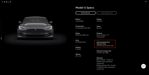 日前,我们从特斯拉美国官网获悉,Model S以及Model X车型最大充电功率参数改变,由此前的200kW最大充电功率提升至250kW。